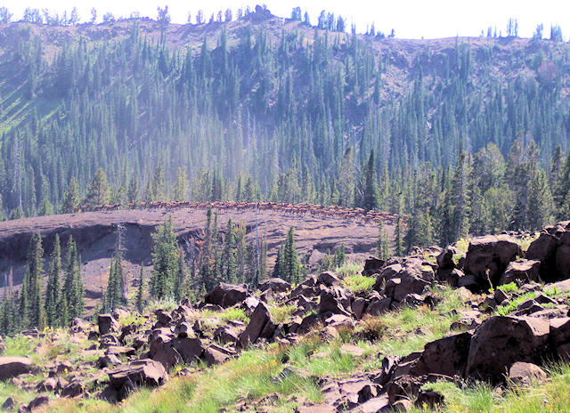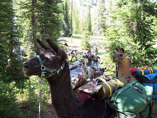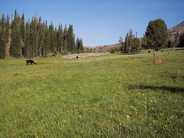 The llamas browse and relax in a meadow near the northern Bonnie Lake. Joyce and Cassidy raft on the lake. The tail end of a large herd of elk passing by.