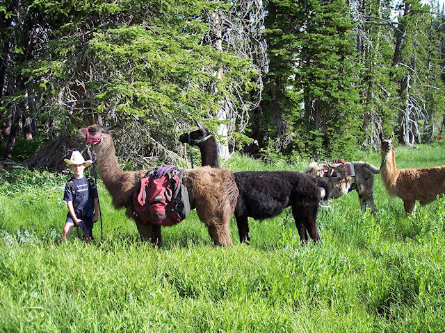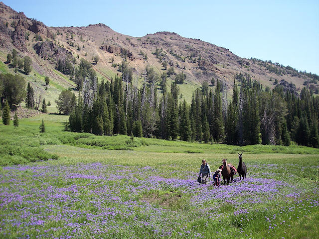 Hiking in requires a few water crossings. Lots of grass to eat everywhere. Cassidy leads a pair of llamas. Julie and Jelly stroll through one of the many lush meadows along the valley.