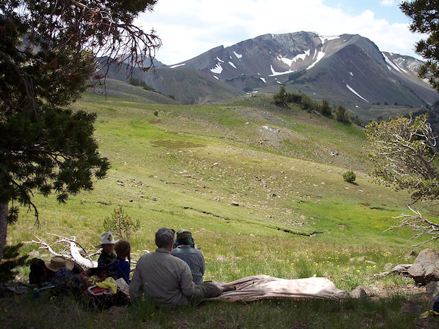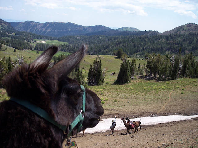 Looking back towards Bonnie Lakes while Julie demonstrates to the attentive llamas how to walk with style and elegance. Taking a picnic break north of Dollar Lake, looking south.