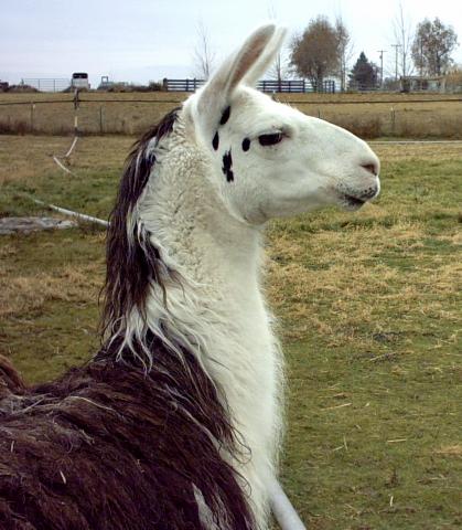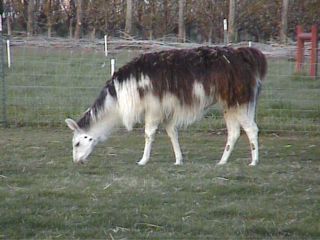 | Dazy is the matriarch of the herd. Although "Granny-May" is the oldest (DOB May 1, 1990), and small in stature, she rules the roost! She seems to be the most clever of the bunch, which she employs to maintain her status, no doubt. At the same time, she is patient and takes great care to teach cria's in the herd the finer points of llama ettiquette. A granddaughter of the well-known Dr. Doolittle, though you wouldn't know it by looking at her. She's low maintenance -- short to medium length classic coat and she did not inherit Dr. Doolittle's toenails. They've never needed trimming. Registered with the International Llama Registry, 94485.