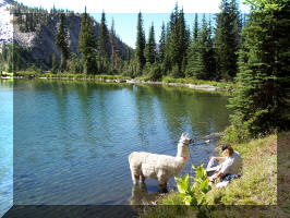 People and llamas relaxing at Bear Lake.